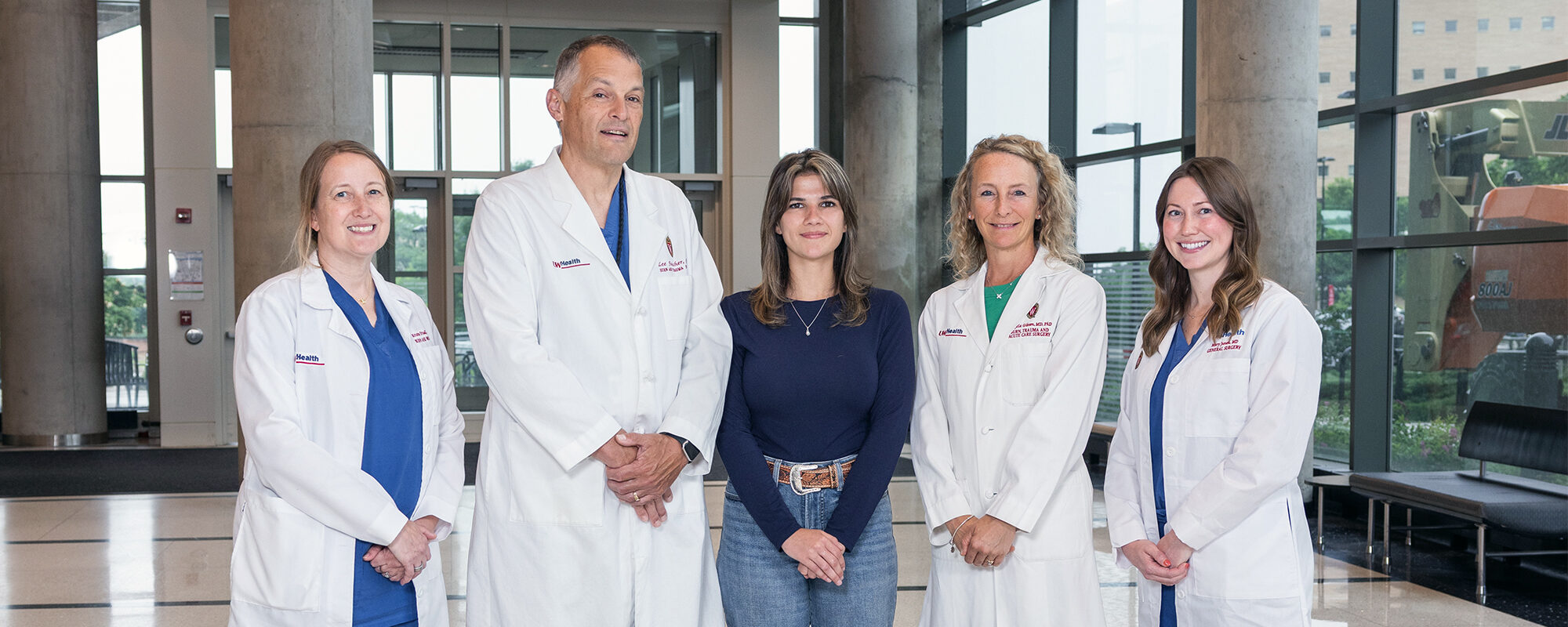 Left to right: Kristin Friedl, RN, DNP, ACACNP-BC; Lee Faucher, MD ’96; patient Ryen Reif; Angela Gibson, MD ’09, PhD ’07 (PG ’14, ’15); and Mary Junak, MD, gather near the entrance to the Wisconsin Institutes for Medical Research in June 2025.