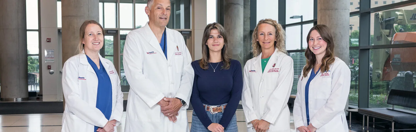 Left to right: Kristin Friedl, RN, DNP, ACACNP-BC; Lee Faucher, MD ’96; patient Ryen Reif; Angela Gibson, MD ’09, PhD ’07 (PG ’14, ’15); and Mary Junak, MD, gather near the entrance to the Wisconsin Institutes for Medical Research in June 2025.